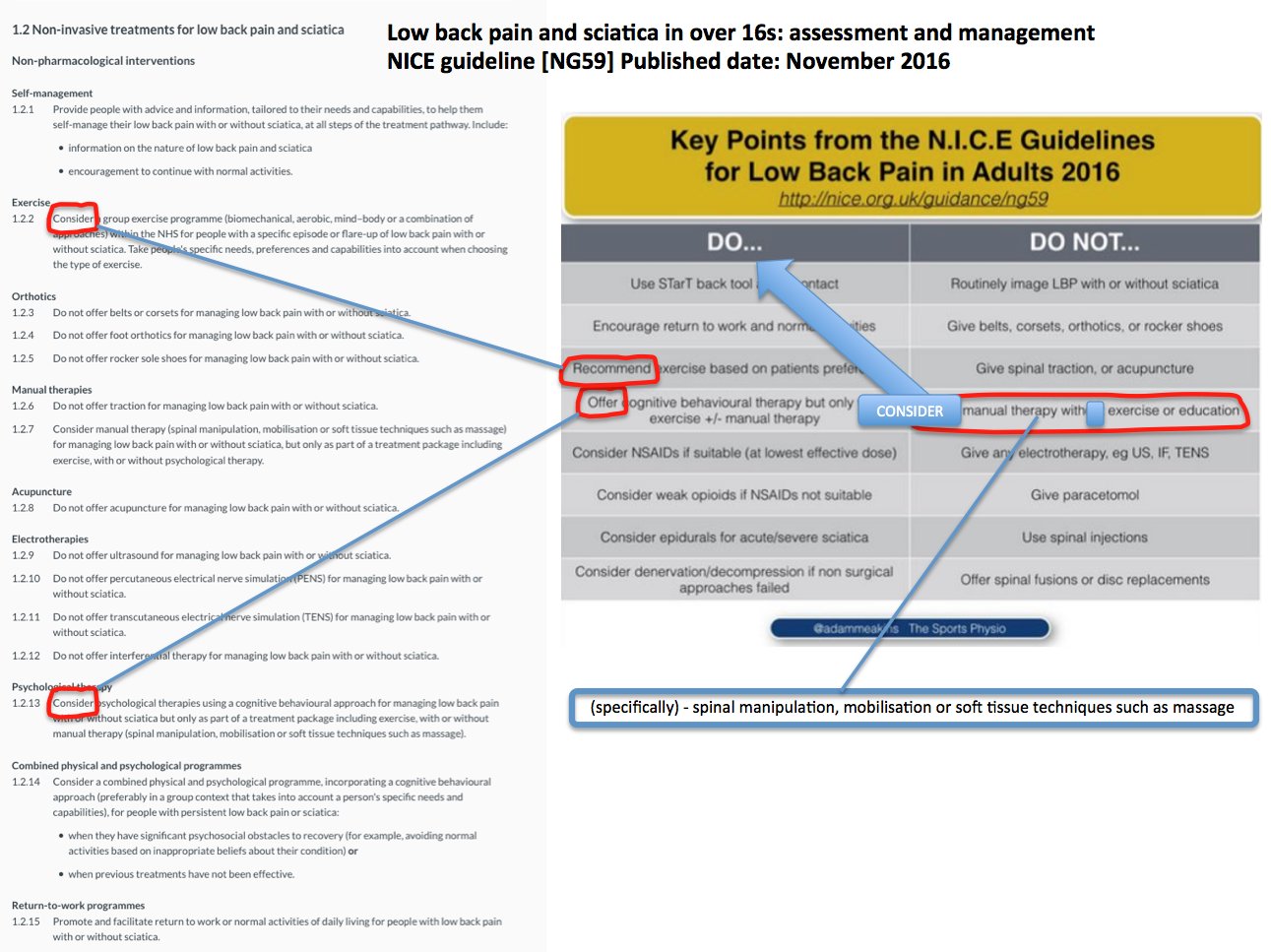 There has been a bit of a spat on twitter, over specific wording on infographics regarding manual therapy (see below for a widely circulated infographic by Adam Meakins and a critical response), as there is some ambiguity over how strongly the guidelines are actually recommending hands-on treatment. This topic really gets physios going but I get the impression that osteopaths have considerably more love for hands-on treatment than the physio profession as a whole, and it’s not (yet) a very controversial issue for us. However if the issue of fact distortion and spin in a post-truth world and its effect on the NICE Guidelines as disseminated via social media interests you, read this interesting blog.